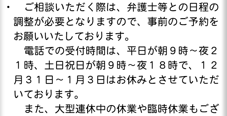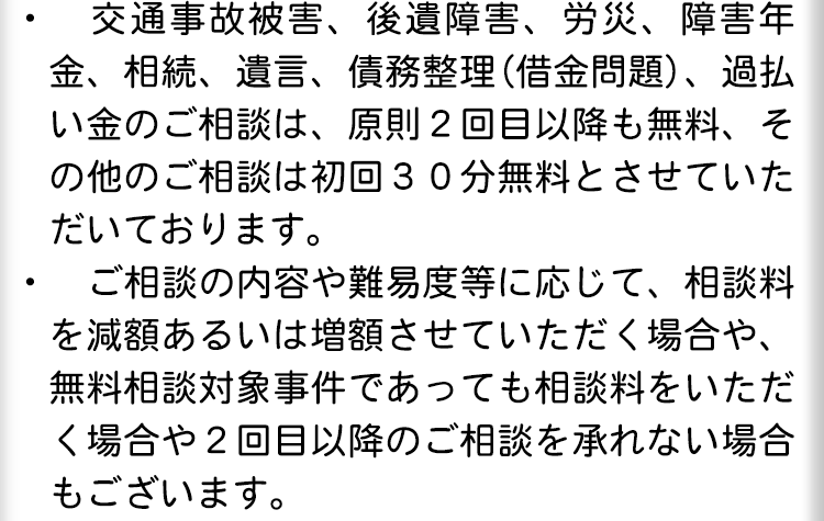 借金関係のお悩みは、個人・法人を問わず原則として相談料無料でお伺いしております。