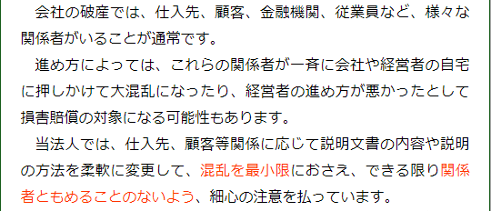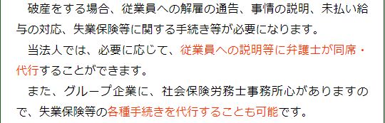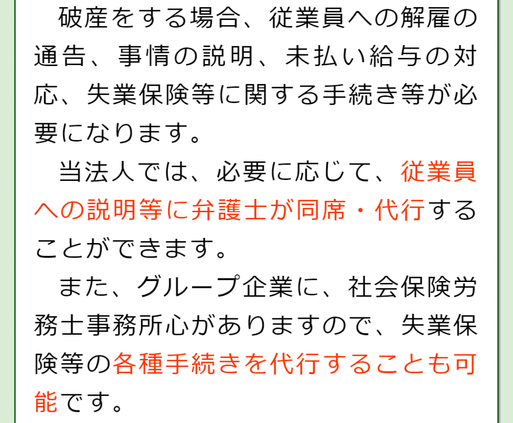 可能な限りご負担が少なくなるよう弁護士も対応いたしますが、従業員は会社破産で解雇すると頼れませんので、代表者の方がご自分で対応しなければならない点も多くあります。