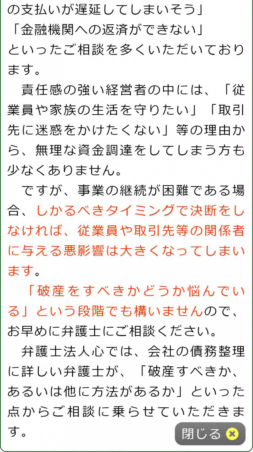早くにご相談いただいて損になることはありませんので、会社の資金繰りに悩まれましたら、お早めに当法人までご相談ください。