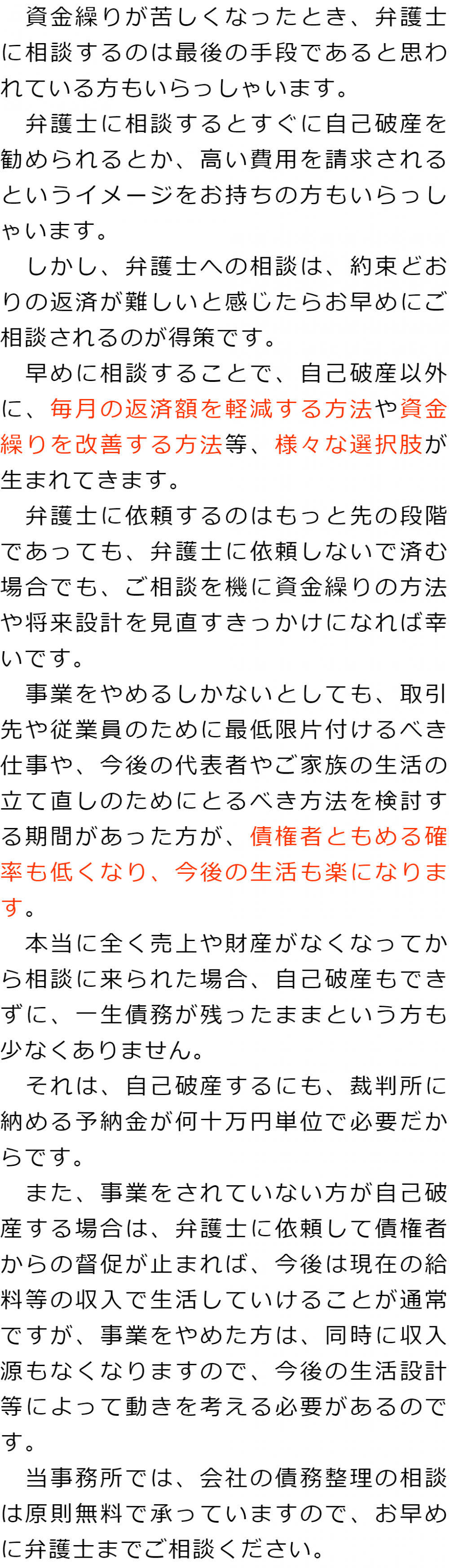 トップその他相談するタイミングを迷われている方へ 階層構造▼ その他(目次) 相談するタイミングを迷われている方へ その他(目次)その他トップ共通バナー元※削除不可新着情報(心グループニュース)電話・テレビ電話相談について代表メッセージ相談するタイミングを迷われている方へ金融機関との関係を壊したくない方へお客様相談室グループ概要費用詳細心グループのメディア出演実績マスコミ関係者の方へ関連リンクプライバシーポリシー 受付時間 平日 9時~21時、土日祝 9時~18時 夜間・土日祝の相談も対応します(要予約) 所在地 〒111-1111 ●町●●建物● 0120-41-2403 お問合せ・アクセス・地図