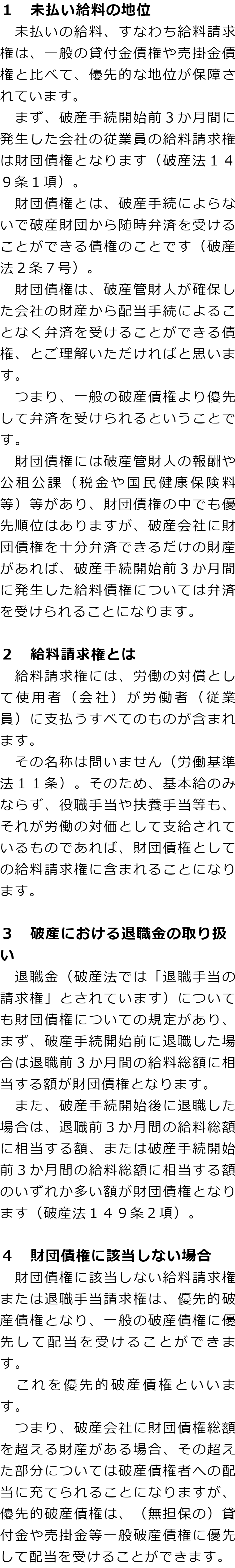 Q会社が破産した場合、未払いの給料はどうなりますか?AQ破産手続きの中で従業員が未払い給料の支払いを受けられない場合、何か救済制度はないのですか?A お役立ち情報・Q&A(目次)お役立ち情報・Q&Aトップお役立ち情報会社破産とリース契約の取り扱い会社破産をしても年金は受給できるかQ&A会社が破産した場合の未払いの給料に関するQ&A 受付時間 平日 9時~21時、土日祝 9時~18時 夜間・土日祝の相談も対応します(要予約) 所在地 〒111-1111 ●町●●建物● 0120-41-2403 お問合せ・アクセス・地図