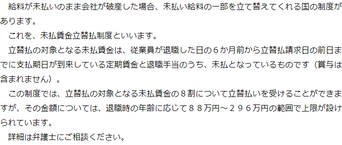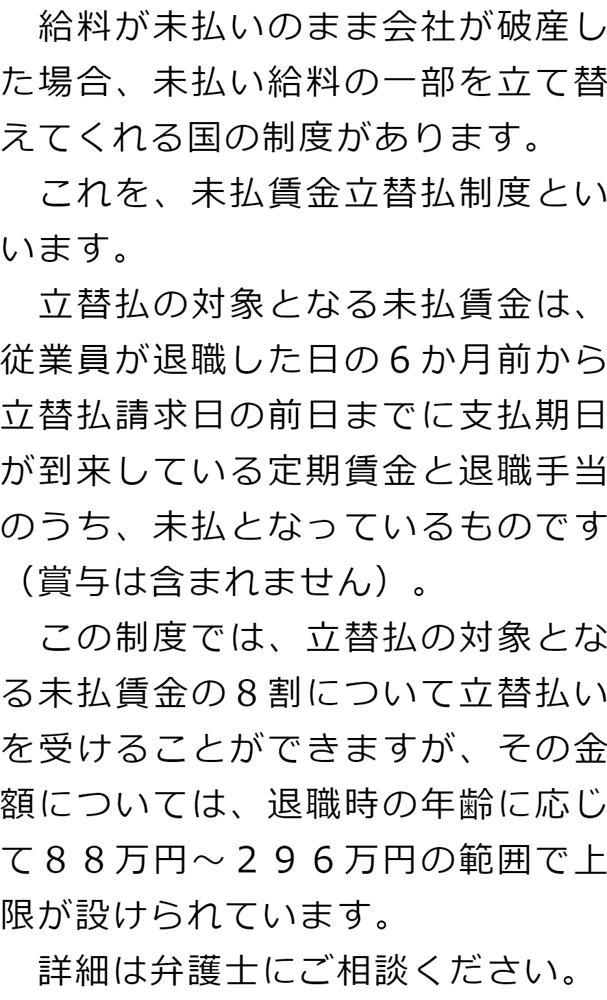 Q破産手続きの中で従業員が未払い給料の支払いを受けられない場合、何か救済制度はないのですか?A お役立ち情報・Q&A(目次)お役立ち情報・Q&Aトップお役立ち情報会社破産とリース契約の取り扱い会社破産をしても年金は受給できるかQ&A会社が破産した場合の未払いの給料に関するQ&A 受付時間 平日 9時~21時、土日祝 9時~18時 夜間・土日祝の相談も対応します(要予約) 所在地 〒111-1111 ●町●●建物● 0120-41-2403 お問合せ・アクセス・地図